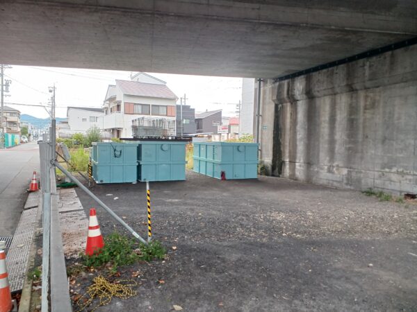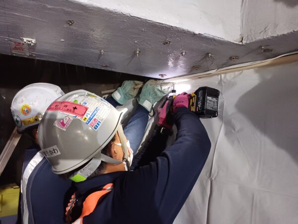 今回の現場の場合は橋脚下にバス停がある為、元請様に防水シートによる養生を準備頂きました。