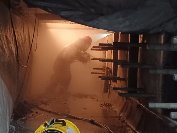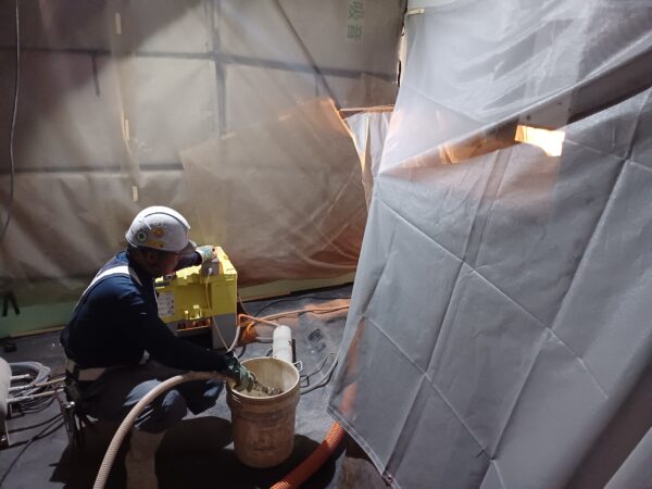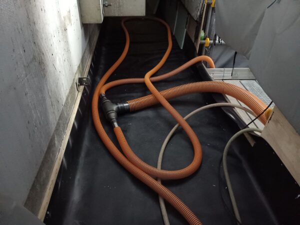 ウォータージェット(以下:WJ)工法では沢山の水が噴射されるため施工箇所から水を落としてはいけない場合、しっかりとした養生を行う必要があります。