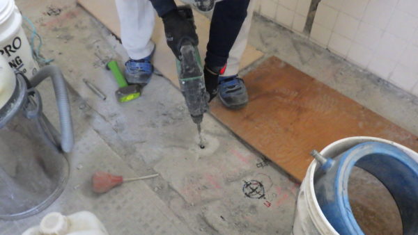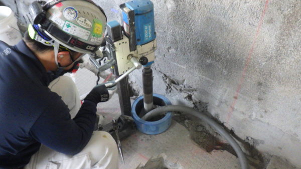スラブの場合、コアガラがや穿孔汚泥が下の階に落ちないよう補助作業員がコア受けを行います。