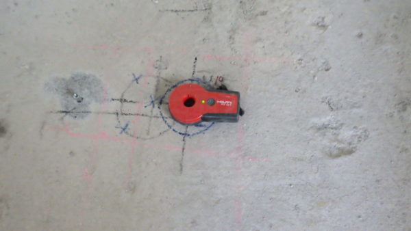 スラブ等のコア貫通先の確認や作業が必要な場合はポインターで裏の墨位置を確認します。